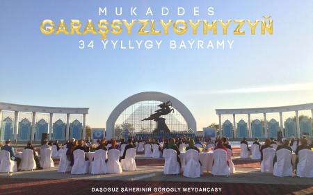 Berkarar döwletiň täze eýýamynyň Galkynyşy döwründe Garaşsyzlygymyzyň 34 ýyllyk toýy uly şatlyk-şowhuna beslendi. Garaşsyzlyk ata-babalarymyzyň özbaşdak döwlet bolmak baradaky arzuwlarynyň amala aşmagyna, köp asyrlyk milli we ruhy gymmatlyklarymyzyň, şeýle hem, arzyly ynsanperwer däplerimiziň dabaralanmagyna mümkinçilik berdi.